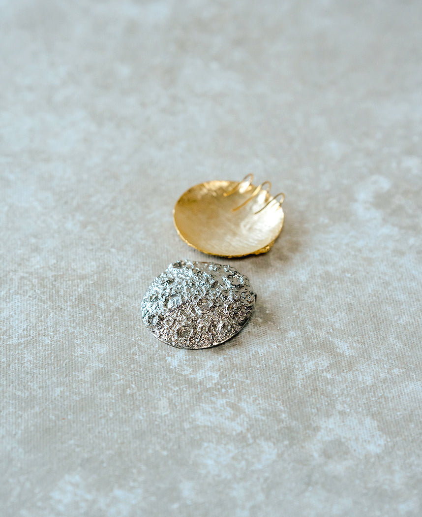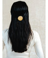 A circular textured hairpin. Handcrafted in brass with nickel plating.