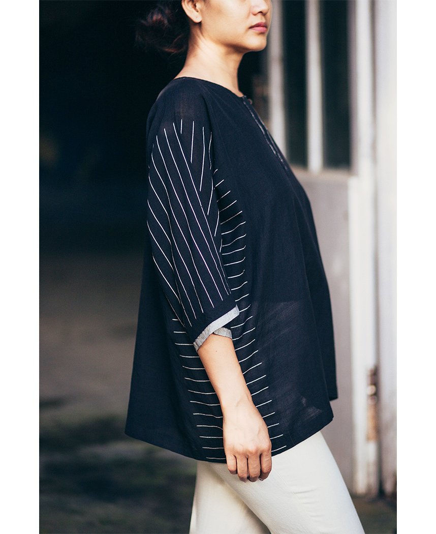 A relaxed tunic style top featuring stripes made using the extra weft method. Made in handwoven cotton with concealed front buttons. Length 27". The model is 5'5" and is wearing size S.