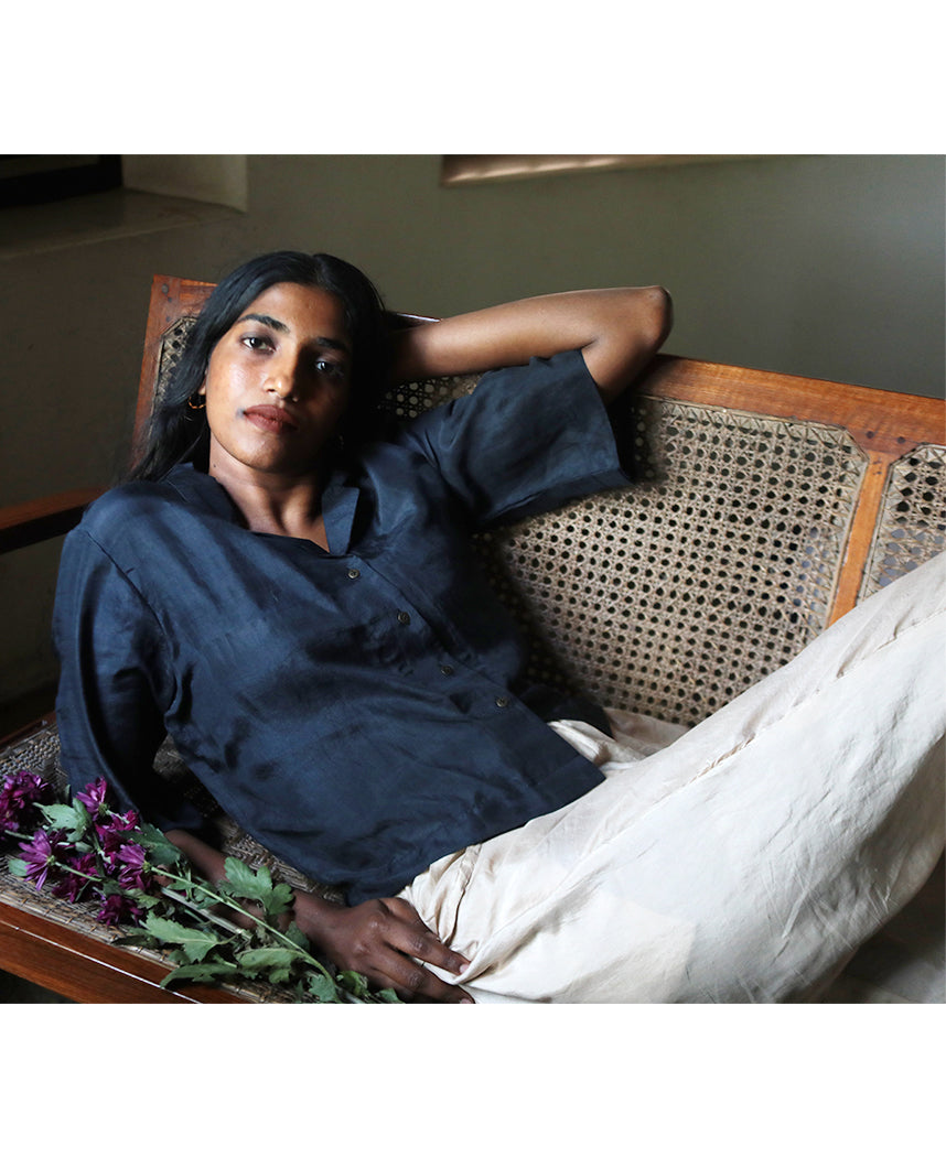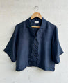 A boxy fit shirt with a pleat detail at the back. Features a clamp collar and a front button placket. Length 20". The model is 5'8" and is wearing a size M.