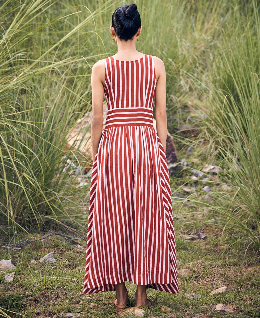 A striped fit and flare dress featuring a V-neck, front button placket, front slit and inseam pockets. Length 52". The model is 5'8" and is wearing size S.