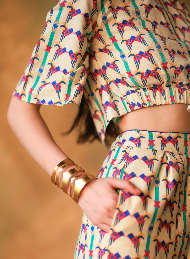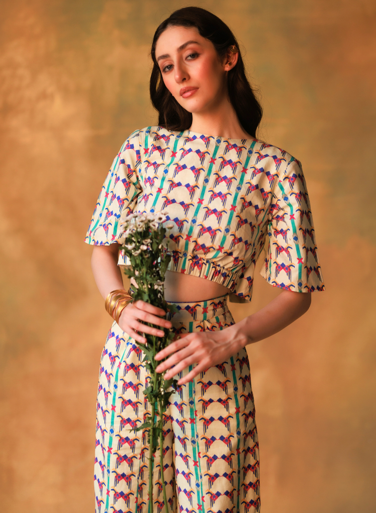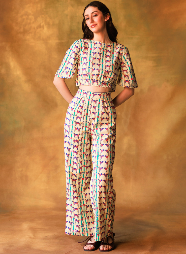 A two-piece set pairing a tie back blouse and matching pants. The tie back blouse features a boat neck and an elasticated hem. Length 15". The matching pants feature a fitted waist and inseam pockets. Length 42". The model is 5'7" and is wearing size XS.