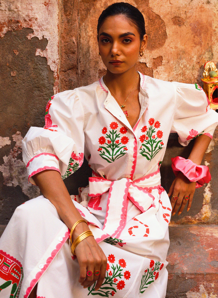 The Chaupad Shirt Dress features a loose fit and vibrant hand block prints in Azo- free colours. The unique mix of patterns is complemented by delicate hand embroidery on the collar, adding an artisanal touch. Perfect for relaxed days with a chic, effortless vibe. Can be worn with or without belt depending on the mood and occasion. The model is 5'8" and is wearing size XS-S.