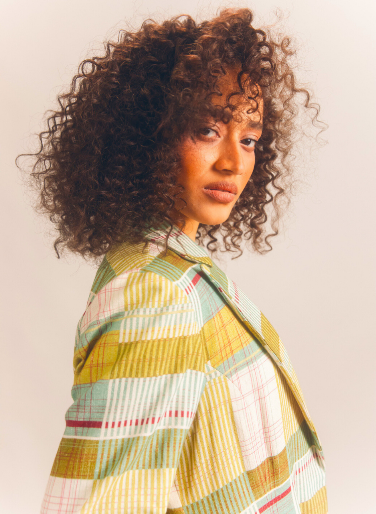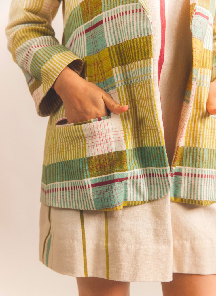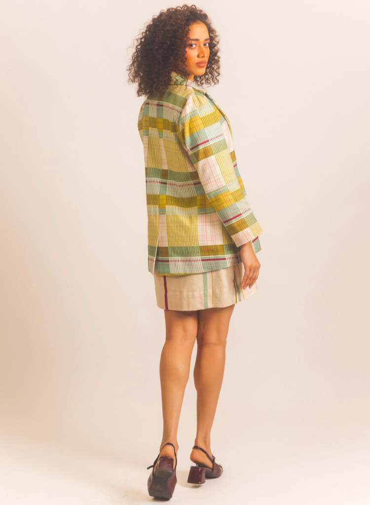 A fitted blazer featuring a lapel collar and a back slit. Length 29". The model is 5'7" and is wearing a size S.