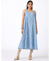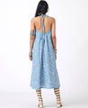 A floral halter neck dress featuring an elasticated back and inseam pockets. Length 48". The model is 5'8" and is wearing size XS.