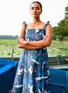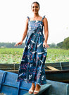 A classic fit-and-flare maxi dress with ruffled shoulder straps featuring a square neckline. Length 50". The model is 5'6" and is wearing a size XS.