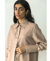 A two piece set pairing the Cinched Waist Shirt and the Split Hem Trousers. The classic shirt features a point collar, cuffed sleeves and a front button placket. Length 26-28" based on size. The straight-leg pants with pintucks feature a fitted waist, a slit at the hem and inseam pockets. Length 39-41.5" based on size. The model is 5'7" and is wearing a size XS.