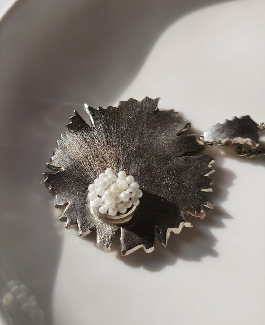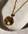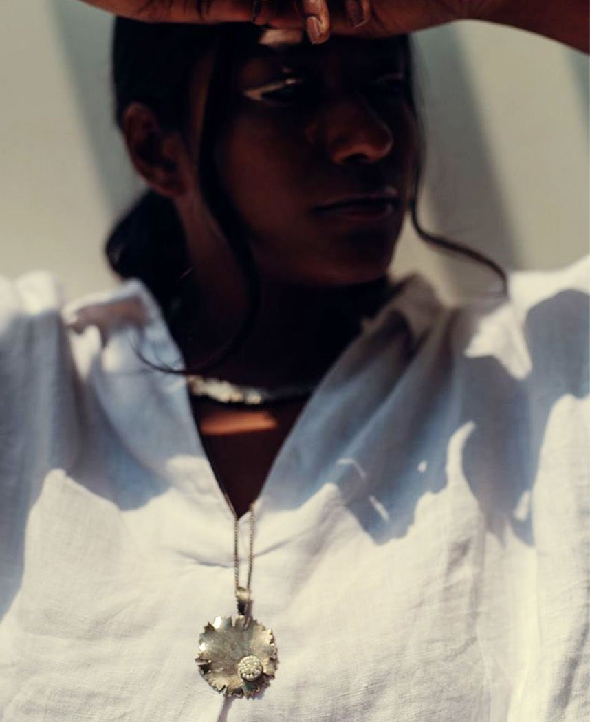 An elegant yet edgy pendant inspired by the shape of pencil shavings and featuring a cluster of glass beads. Comes with a chain. Shown on the model with the Cherish Choker, Tassel Choker and Charmer Necklace. Handcrafted in brass with nickle plating.