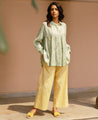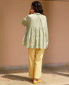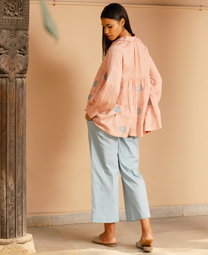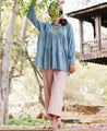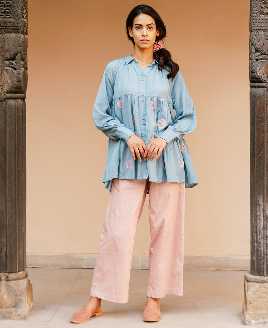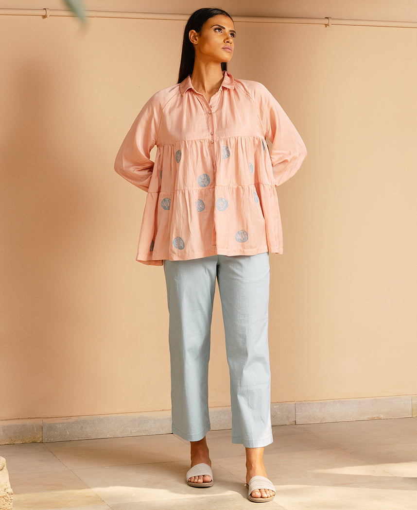 A tiered raglan sleeve top with hand-embroidered flowers on appliqué polka dots. Features a classic collar and a front placket with hand-embroidered buttons. Length 27". The model is wearing a size S. Made in 100% organic soy fiber cotton.