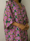 A hand block printed easy fit dress with floral shell buttons featuring a V-neck, a front button placket, 3/4th sleeves and side slits. Length 40". The model is 5'7" and is wearing a size M.