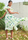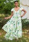A printed midi tiered dress with gathered tiers, ruffle structured sleeves and lace details featuring a plunging V-neckline and concealed back zipper opening. Length 49”. The model is 6ft and is wearing a size S.