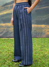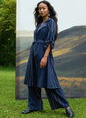 A two-piece set pairing the Cobalt Trench Overlay and the Cobalt Flared Trousers. The trench-style overlay features a striking collar and stylish 3/4 sleeves. Length 42". The flared pants feature a fitted waist and inseam pockets. Length 40". The model is 5'6" and is wearing a size S.