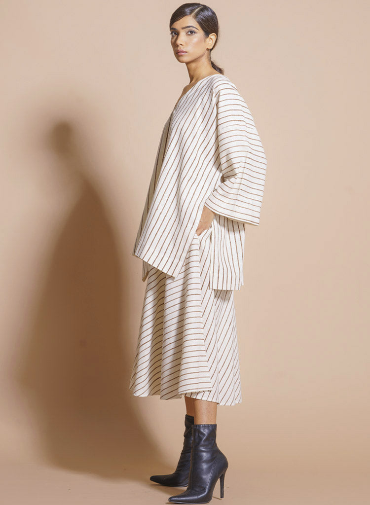 A striped A-line skirt featuring an elasticated waist and inseam pockets. Length 30". The model is 5'8" and is wearing size S.