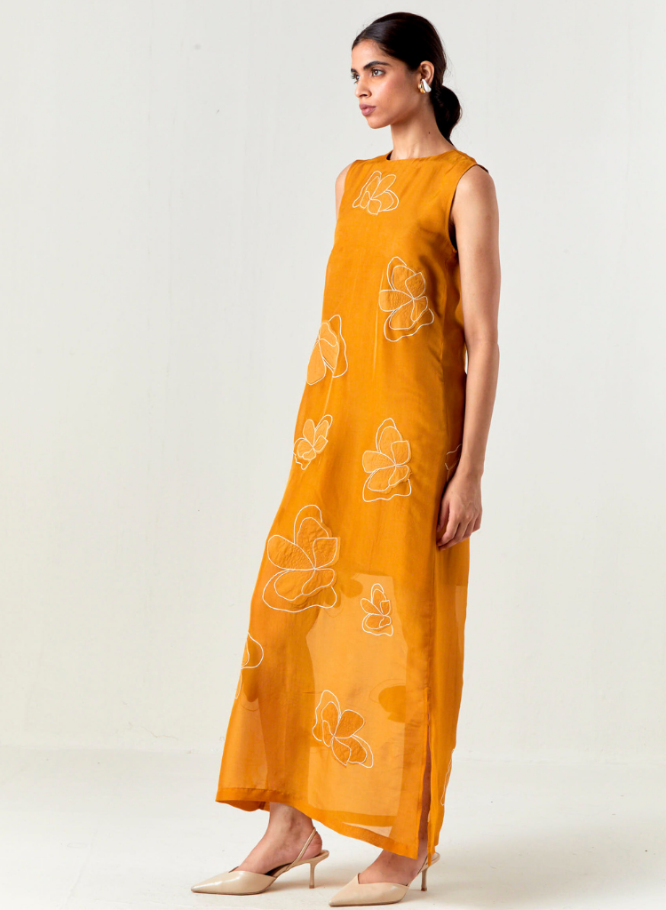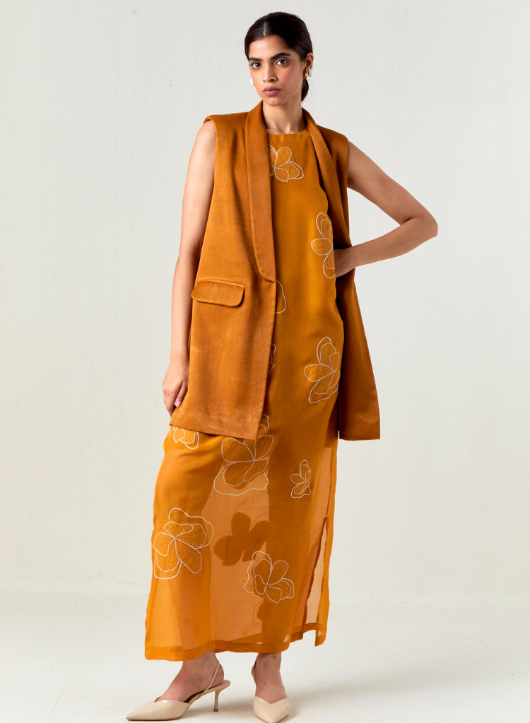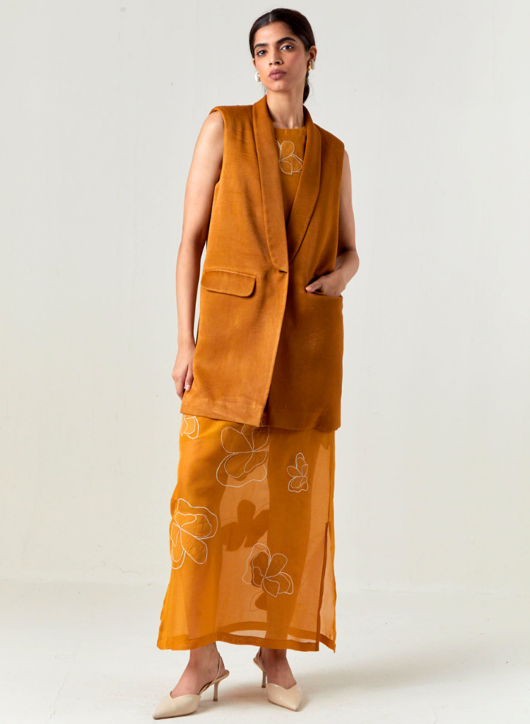 A two-piece set pairing a sleeveless waistcoat and a sheer floral dress. The relax fitting waistcoat features a lapel collar detail and flap pockets. Length 30". Made in crepe satin. Lined. The sheer dress features floral appliqué detail and side slits. Length 47". Made in organza.