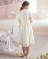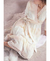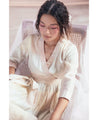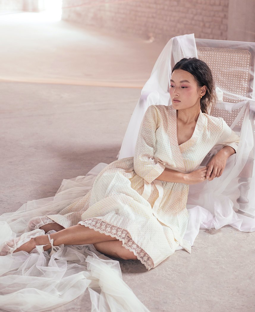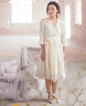 A relaxed wrap style dress with delicate hand block printed polka dots in pastel shades. Features a lace hem, gathered waist and inseam pockets. Comes with a tie up belt. Length 42". The model is 5'6" and is wearing size S.