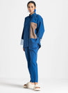 A two piece set pairing the Contrast Detail Shirt and the New Narrow Bottoms. The loose fitting shirt with contrast pocket detail and a back pleat features a concealed front button placket and net at the sleeves. Length 28". Narrow Bottoms in blue with side stripe detail feature inseam pockets and an elasticated waist. Length 40". The model is 5'6" & is wearing size S.