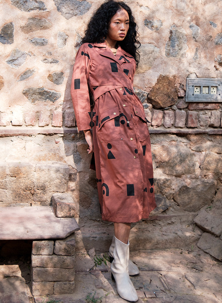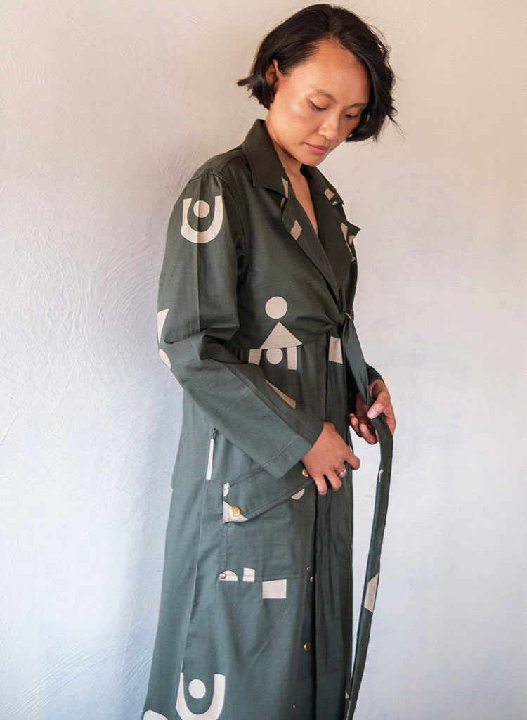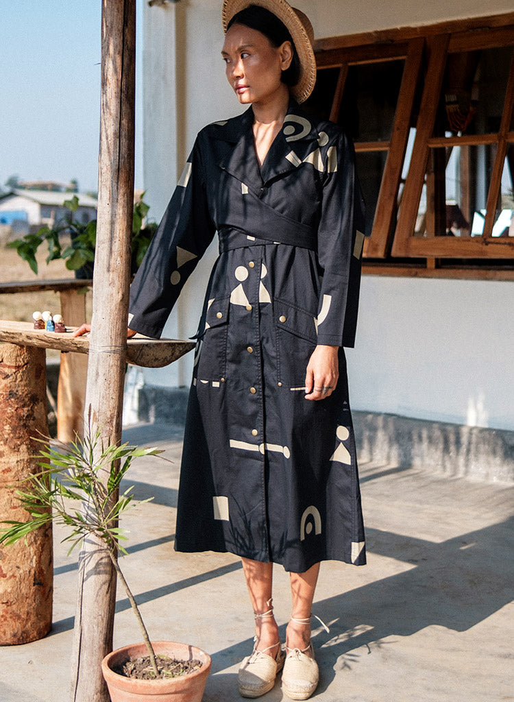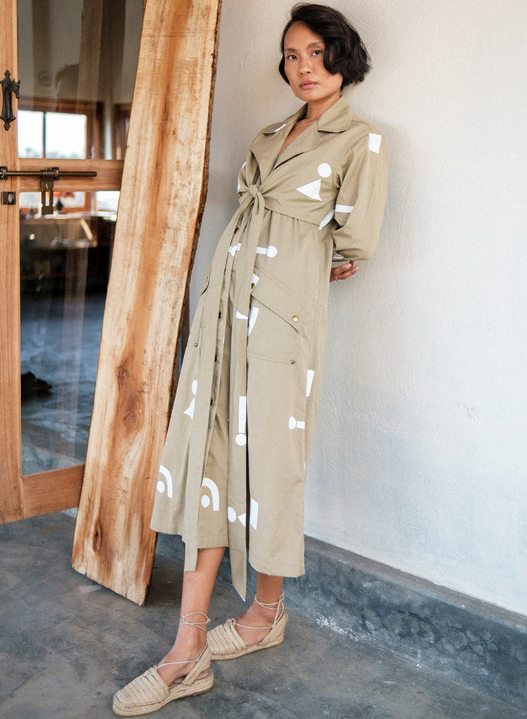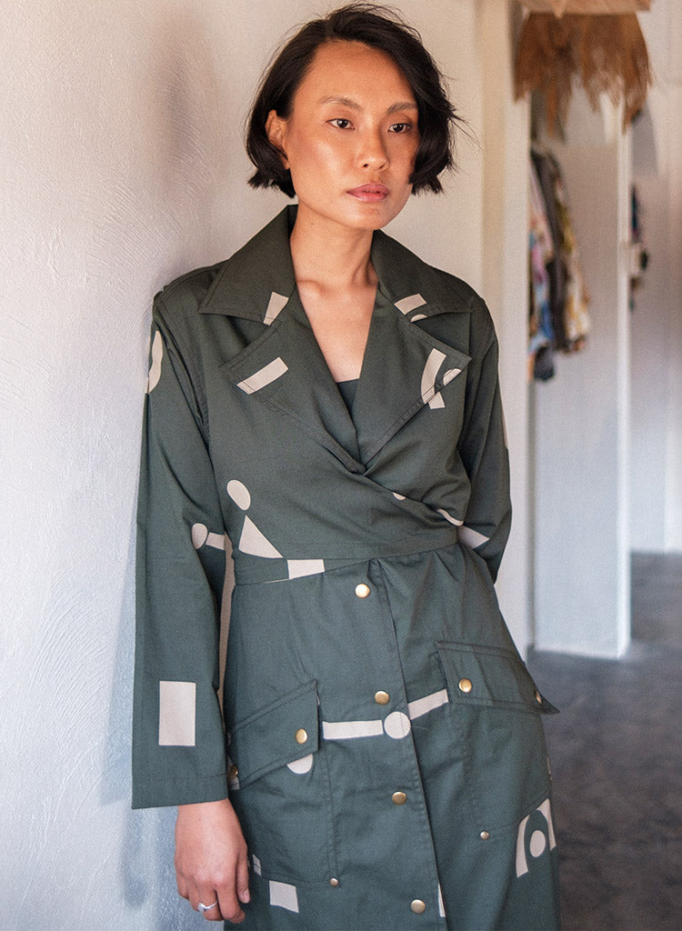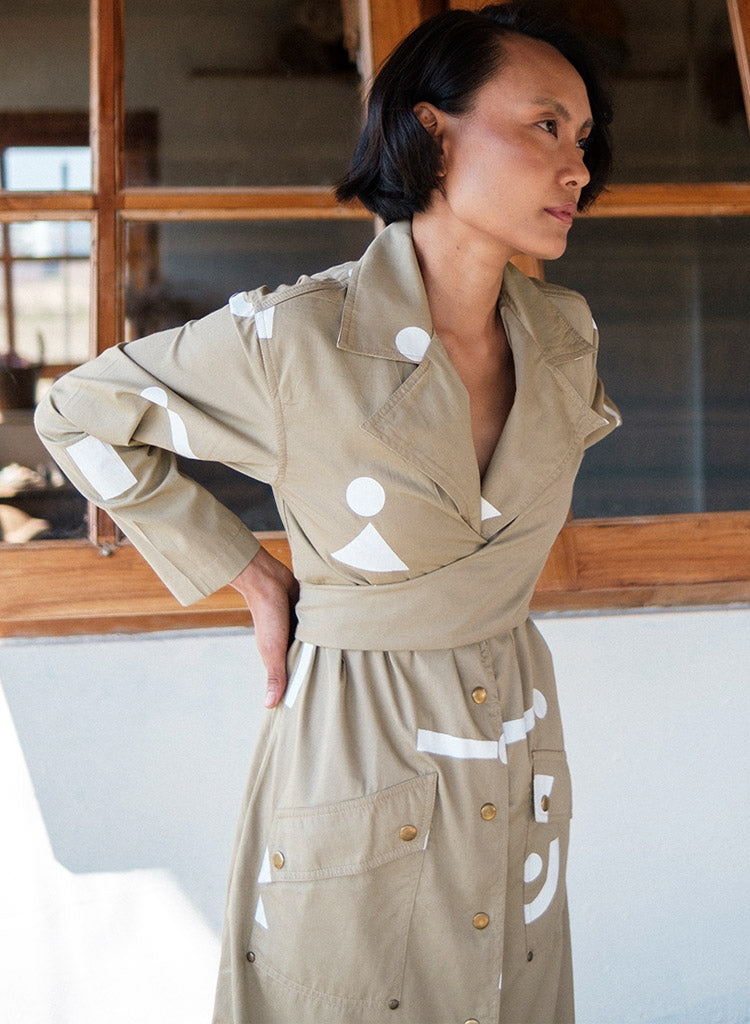 A trench dress with overlapping wrap detail on the front bodice with tie-up at the back, front button-down opening and flap patch pockets featuring a notched collar, and long sleeves with a slit at the centre back hem. The model is 5'7", and is wearing size S.