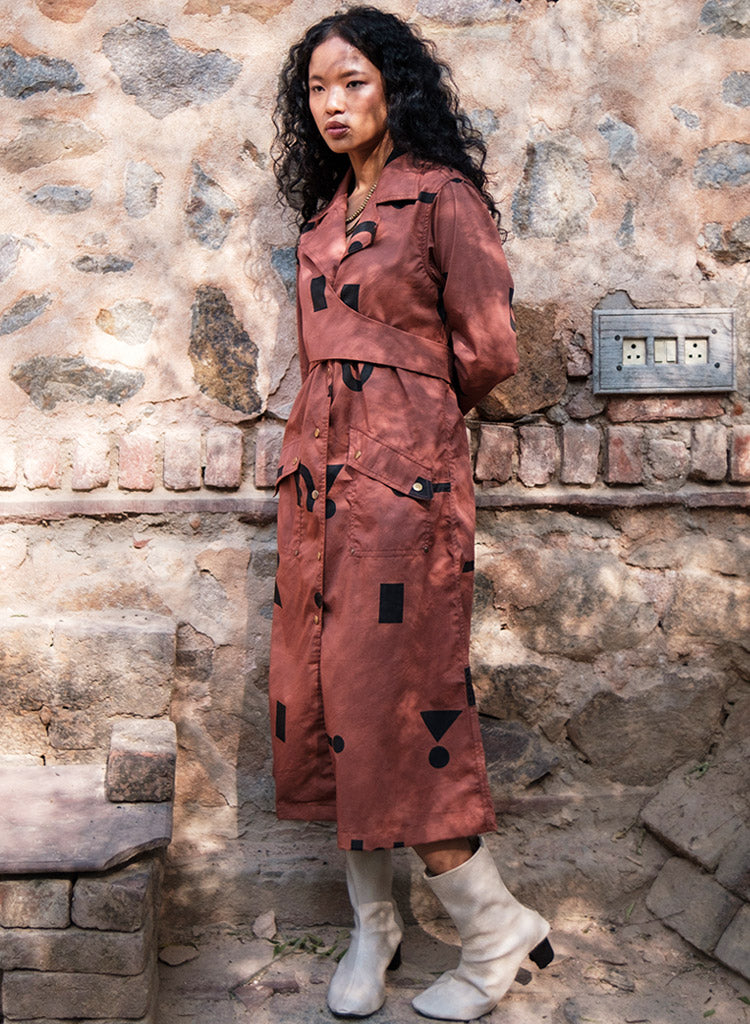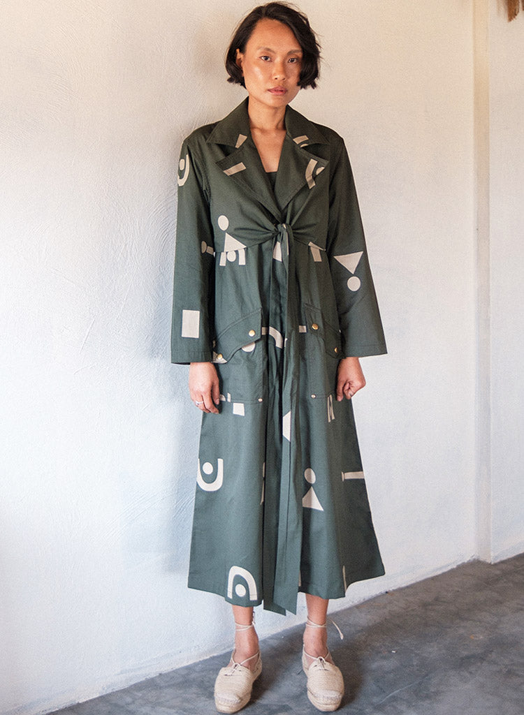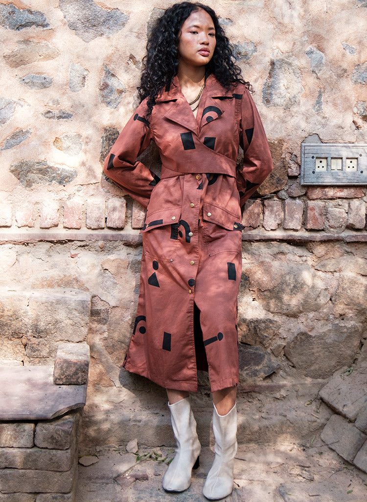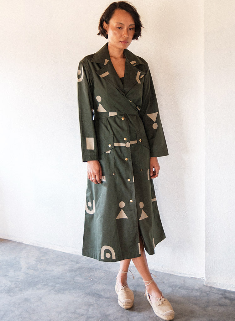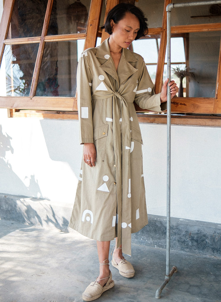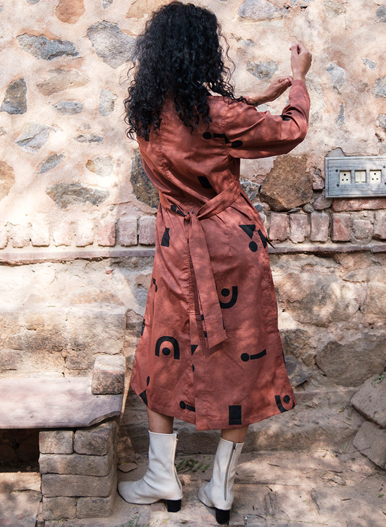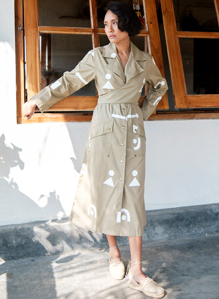 A trench dress with overlapping wrap detail on the front bodice with tie-up at the back, front button-down opening and flap patch pockets featuring a notched collar, and long sleeves with a slit at the centre back hem. The model is 5'7", and is wearing size S.