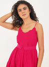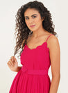 A timeless Jamdani dress featuring a delicate scallop neckline and graceful noodle straps, complemented by soft gathers that add a touch of elegance. The dress is tailored to perfection with a discreet back zipper fastening for a sleek silhouette, convenient side pockets and a coordinating Jamdani belt, offering both style and practicality. Length 53". The model is 5'8" and is wearing size S.