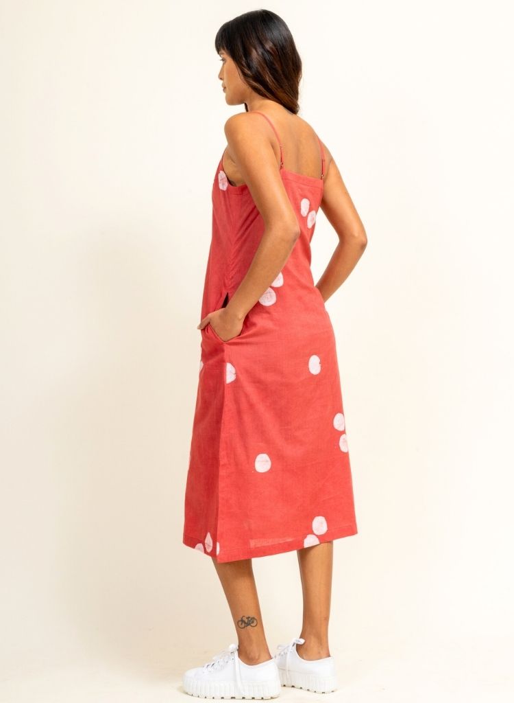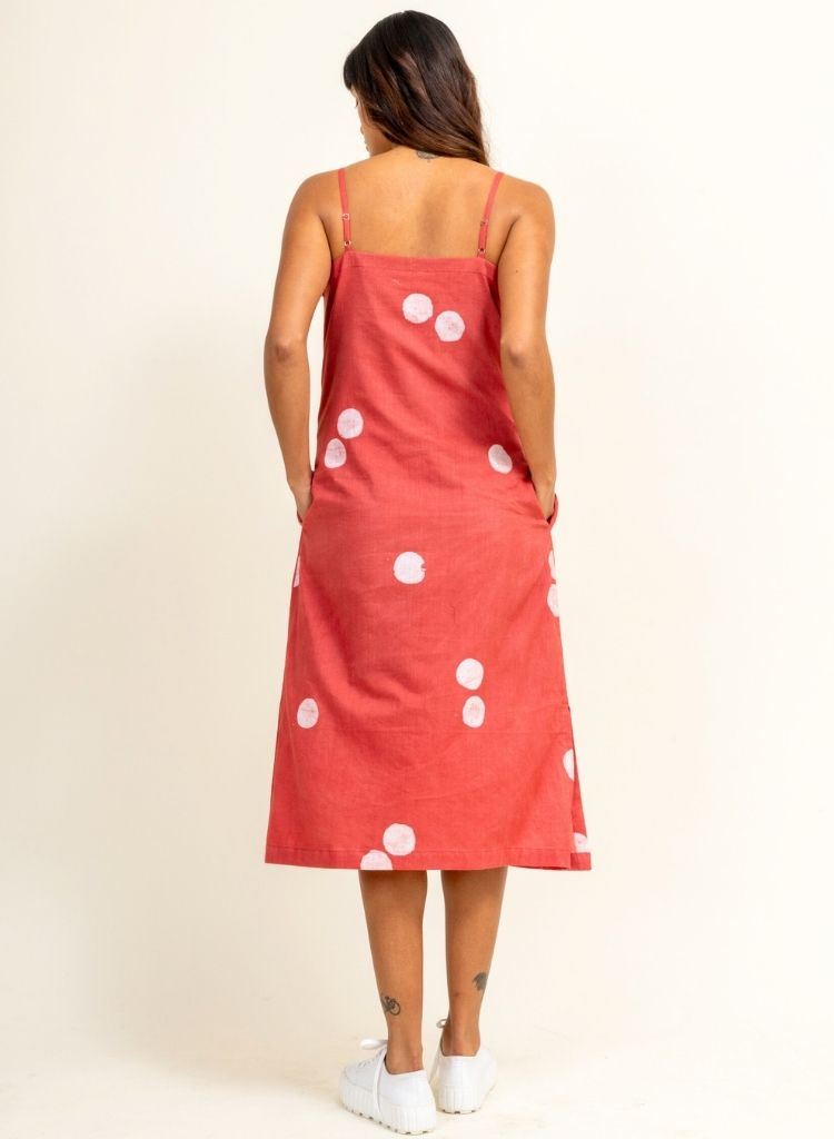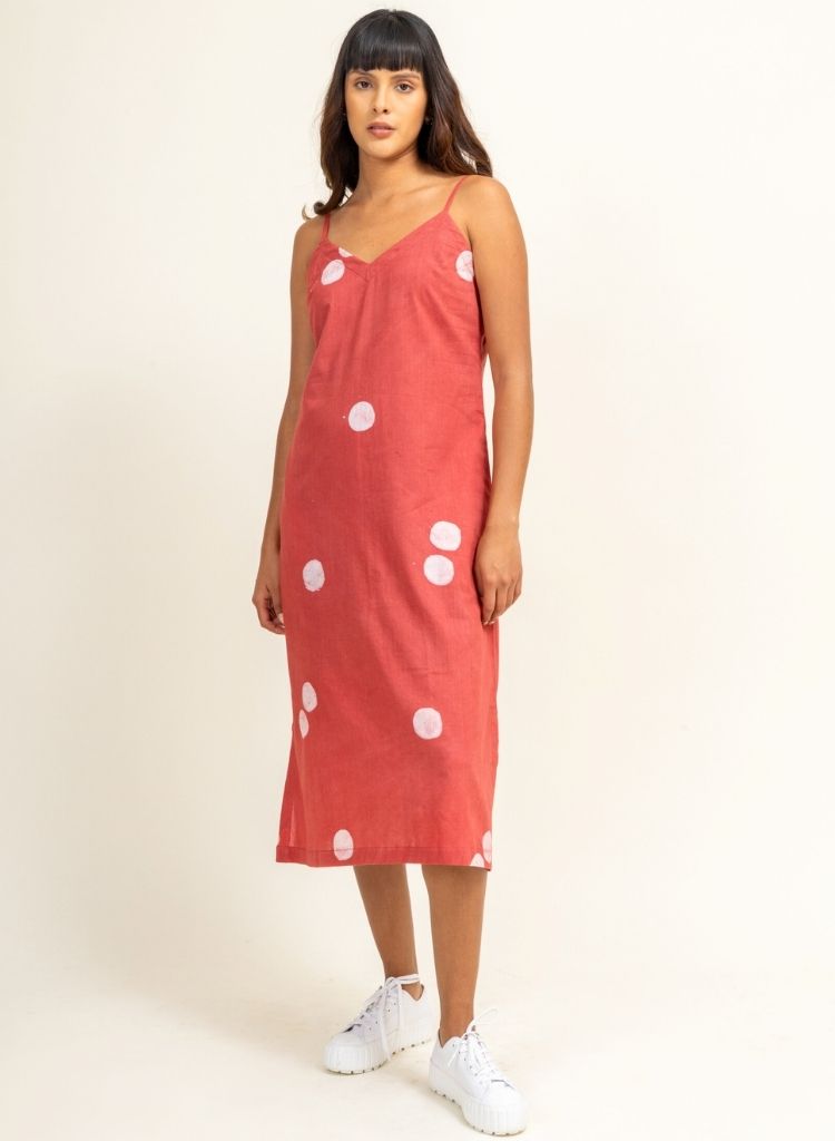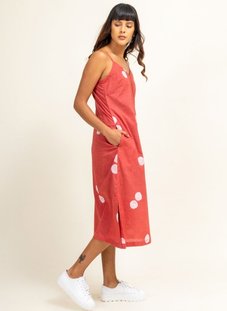 A batik polka printed midi slip dress with adjustable straps featuring side pockets. Length 46". The model is 5'9" and is wearing size M.