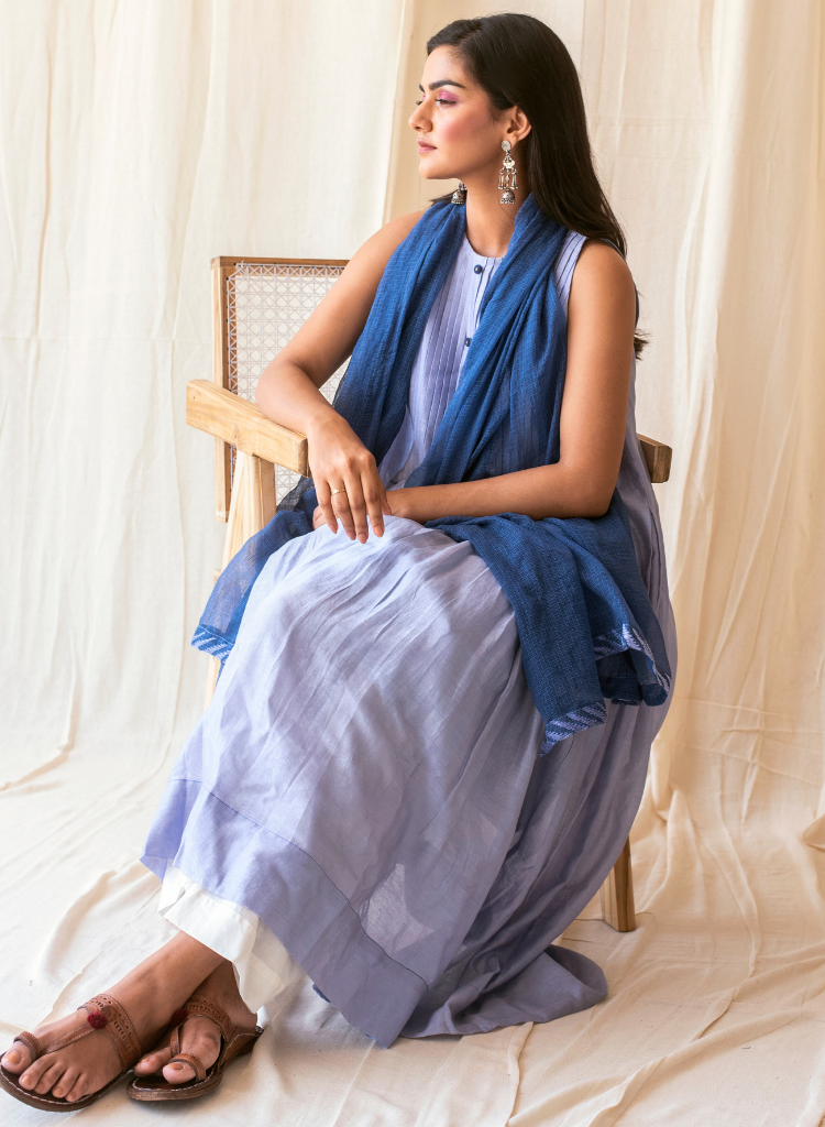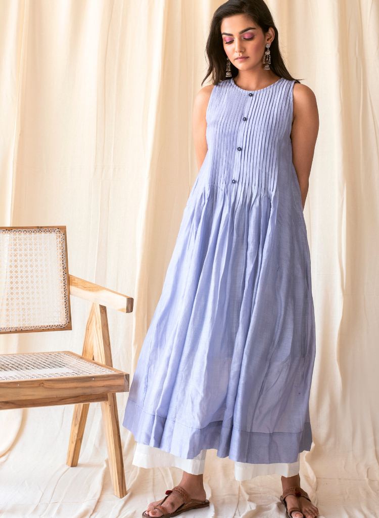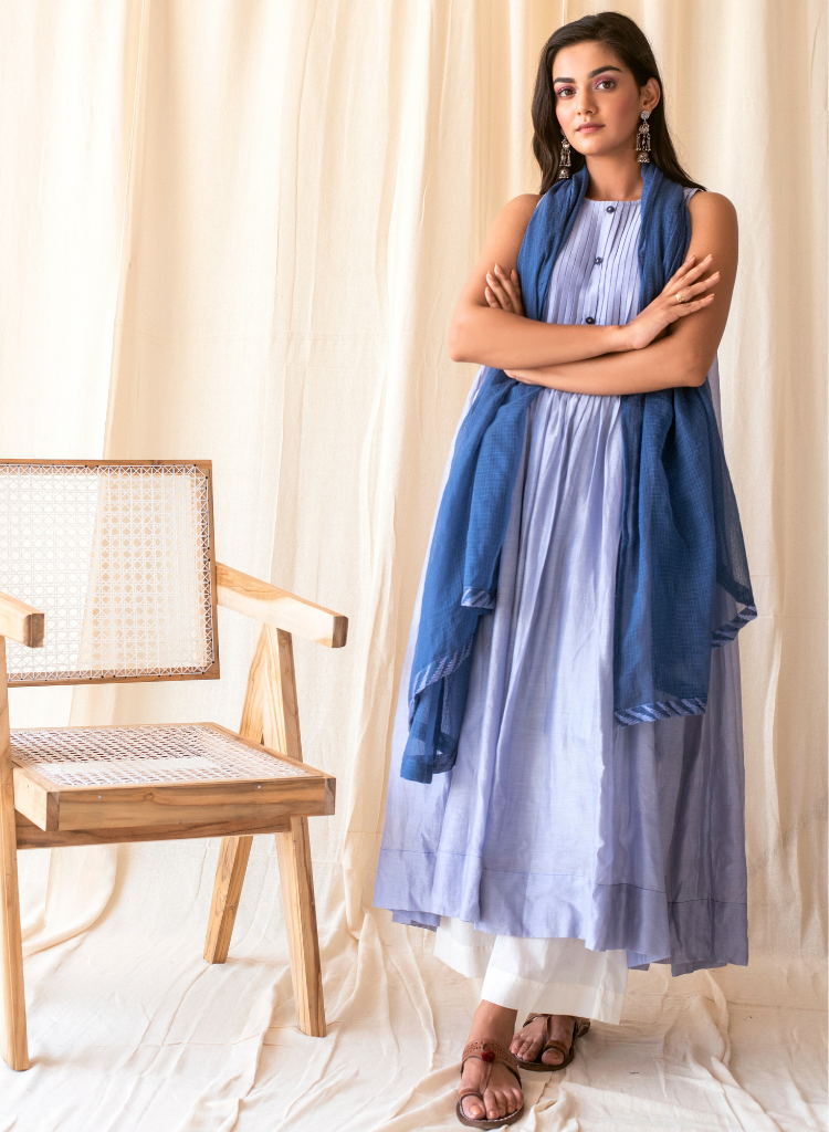 A three-piece set pairing a kurta, a straight pants and a dupatta. The kurta features knife pleats from the shoulder to the waistline with two pockets on each side and hand embroidered buttons on the front placket. Length 48". Made in Chanderi Silk. The pants features an elasticated back. Length 38". Made in handloom cotton. The dupatta features hand embroidered border. Made in Kota Doria.