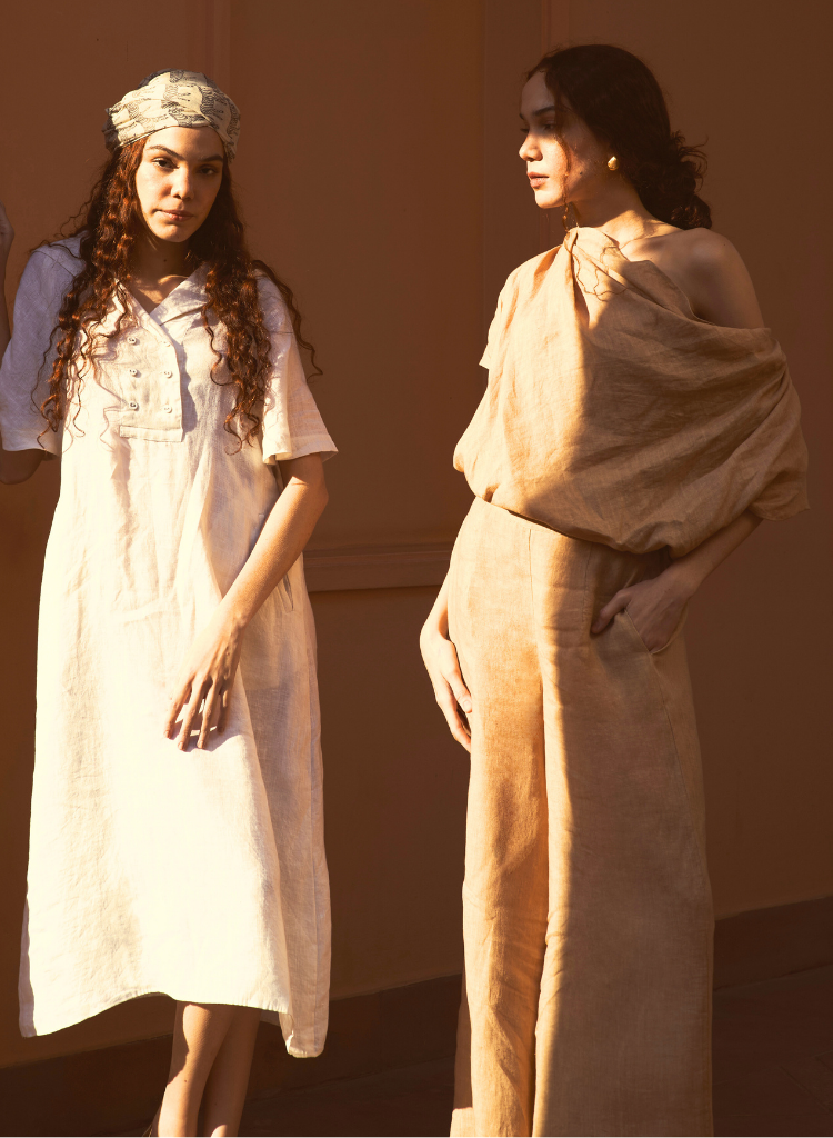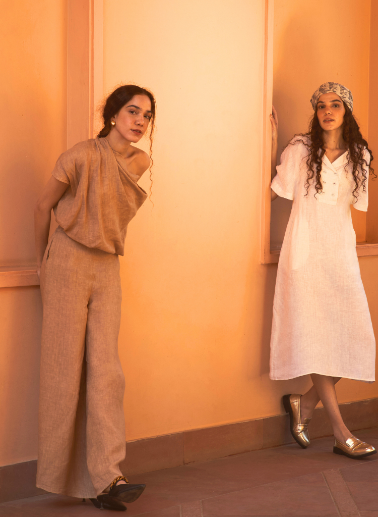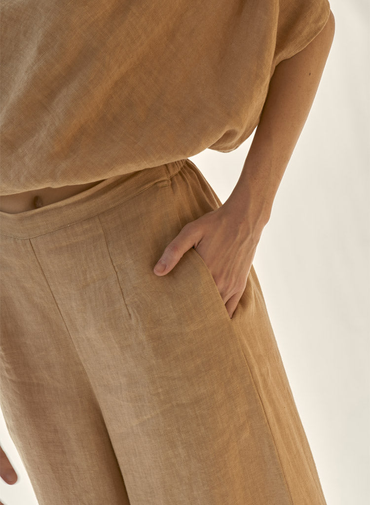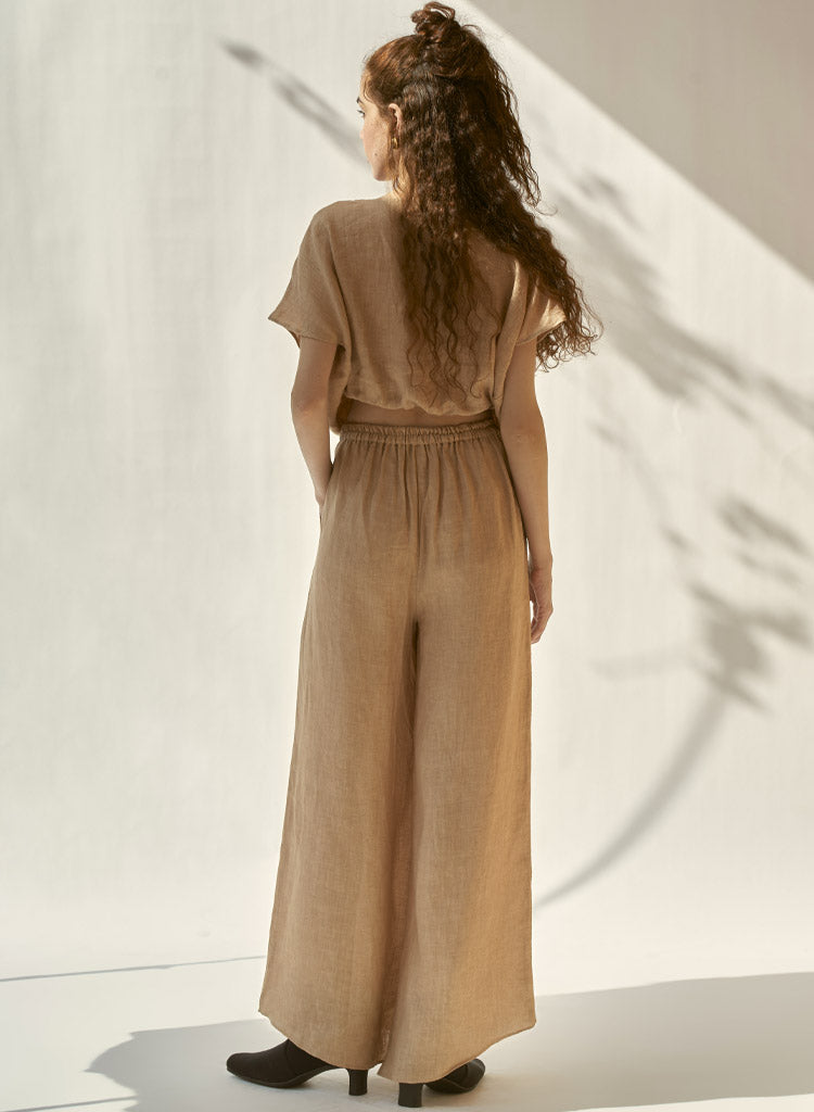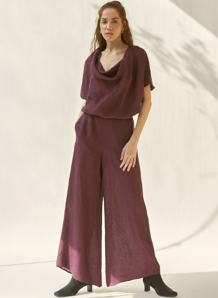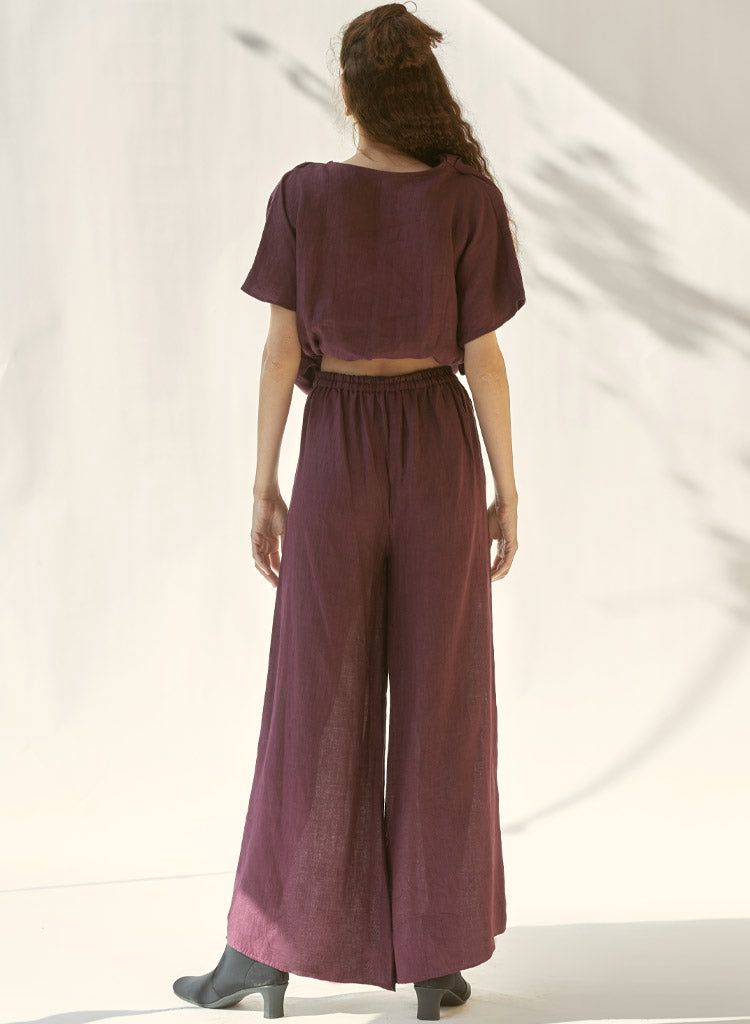 A two-piece set pairing a crop top and a flared pants. The crop top features a draped neck which can be worn in multiple styles. Length 17". The matching flared pants feature a fitted front, an elasticated back and inseam pockets. Length 36". The model is 5'8" and is wearing a size S.