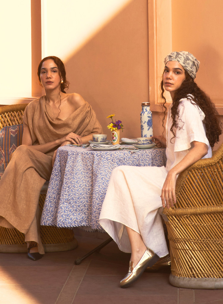 A two-piece set pairing a crop top and a flared pants. The crop top features a draped neck which can be worn in multiple styles. Length 17". The matching flared pants feature a fitted front, an elasticated back and inseam pockets. Length 36". The model is 5'8" and is wearing a size S.