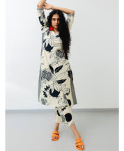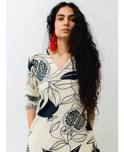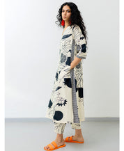 A printed A-line kurta with stripe details featuring a V-neck and inseam pockets. Length 46". The model is 5'7" and is wearing size M.