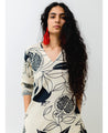 A two-piece set pairing the Pomegranate Kurta and matching pants. The printed A-line kurta with stripe details features a V-neck and inseam pockets. Length 46". The matching pants feature a fitted front and elasticated back. Length 36". The model is 5'7" and is wearing size M.