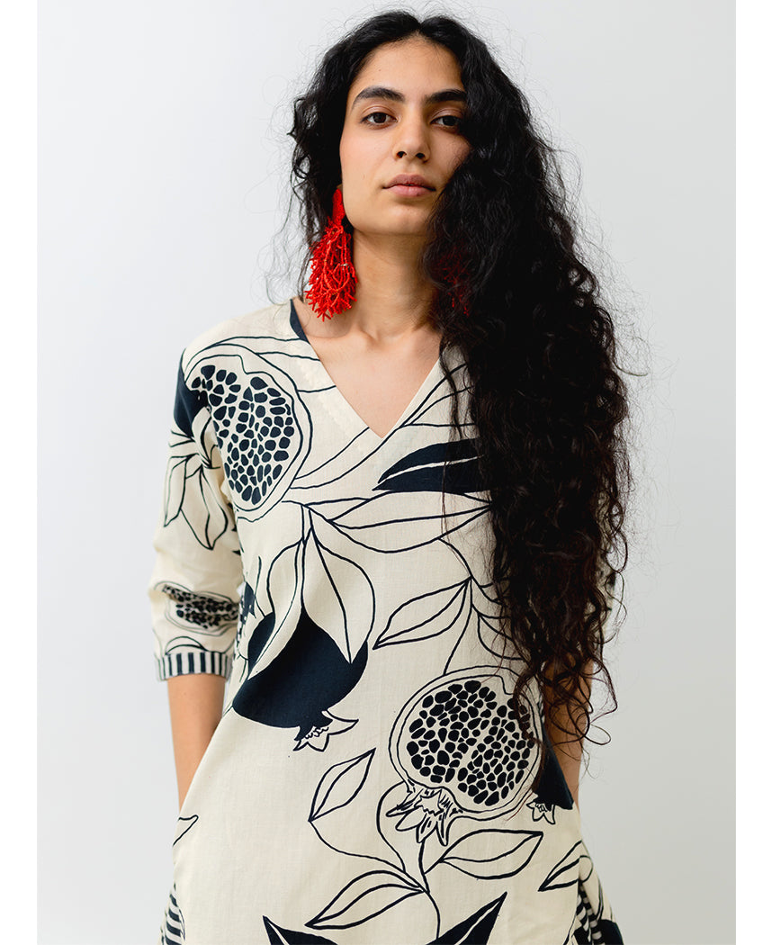 A printed A-line kurta with stripe details featuring a V-neck and inseam pockets. Length 46". The model is 5'7" and is wearing size M.