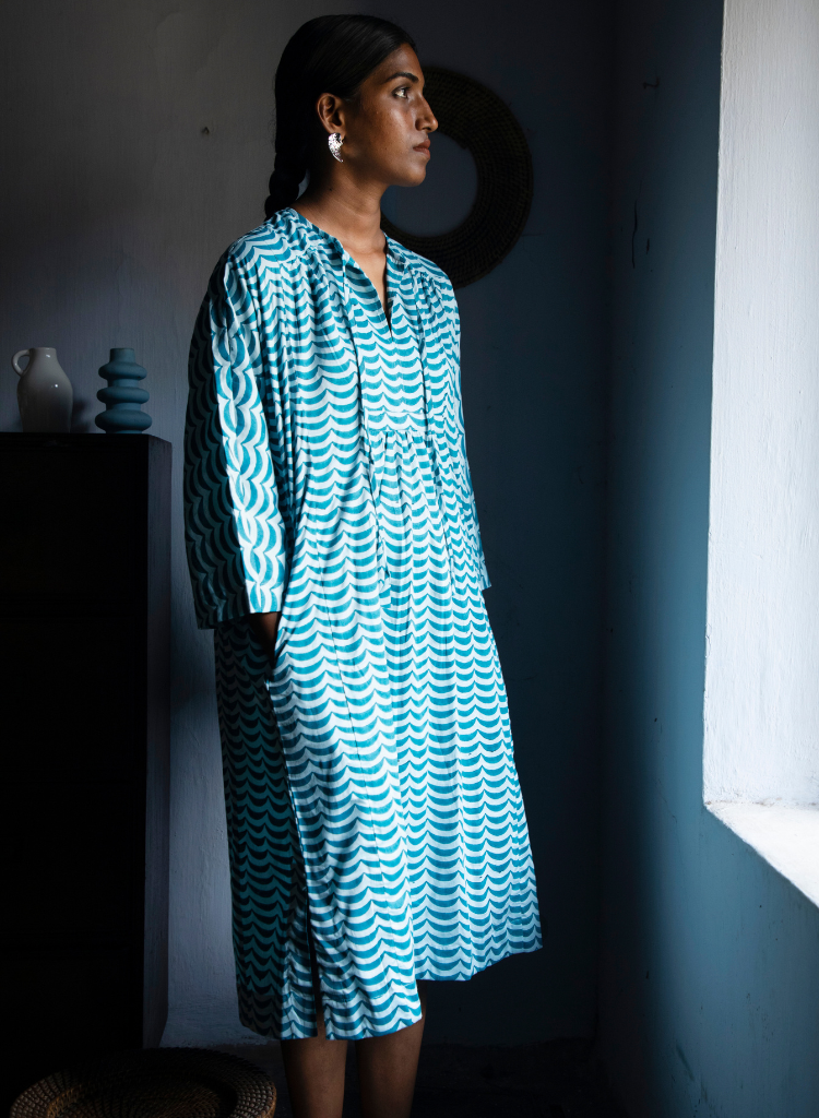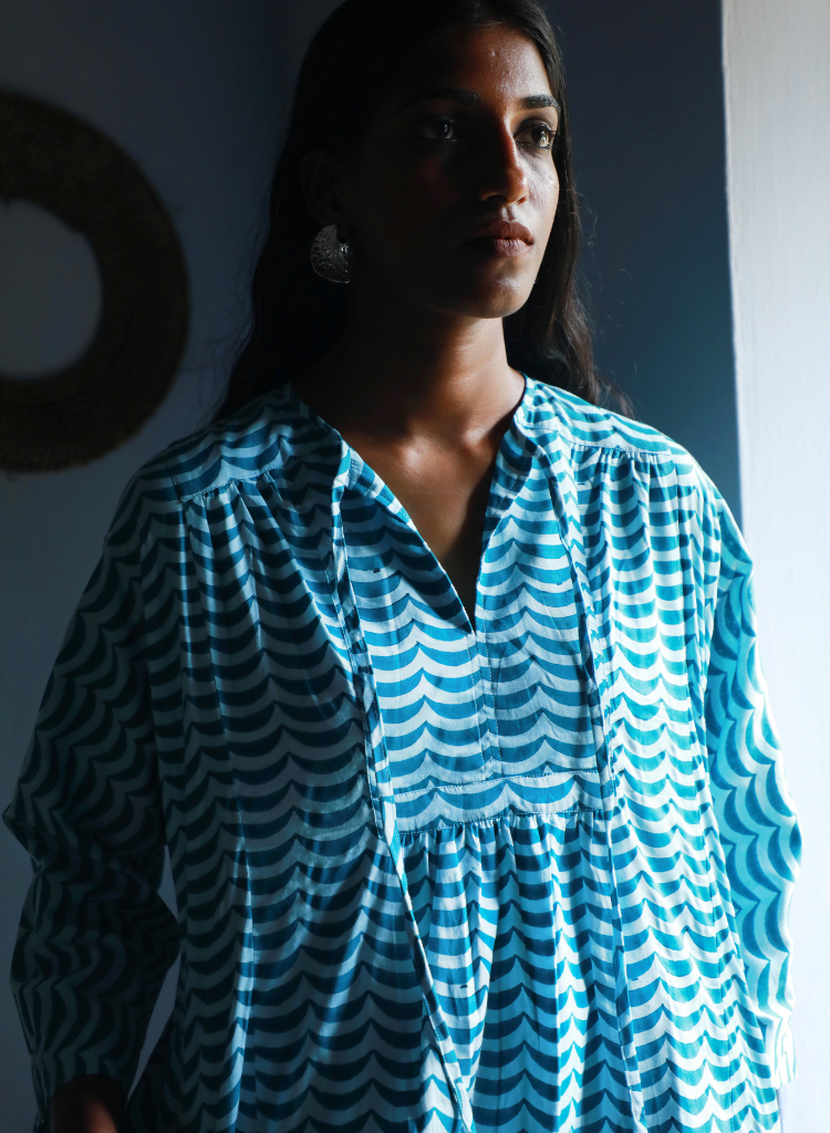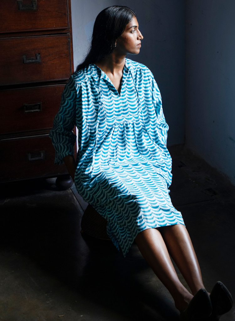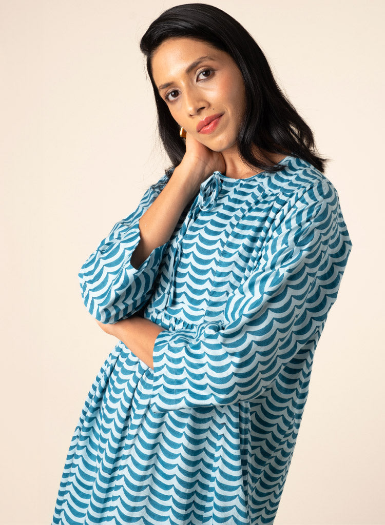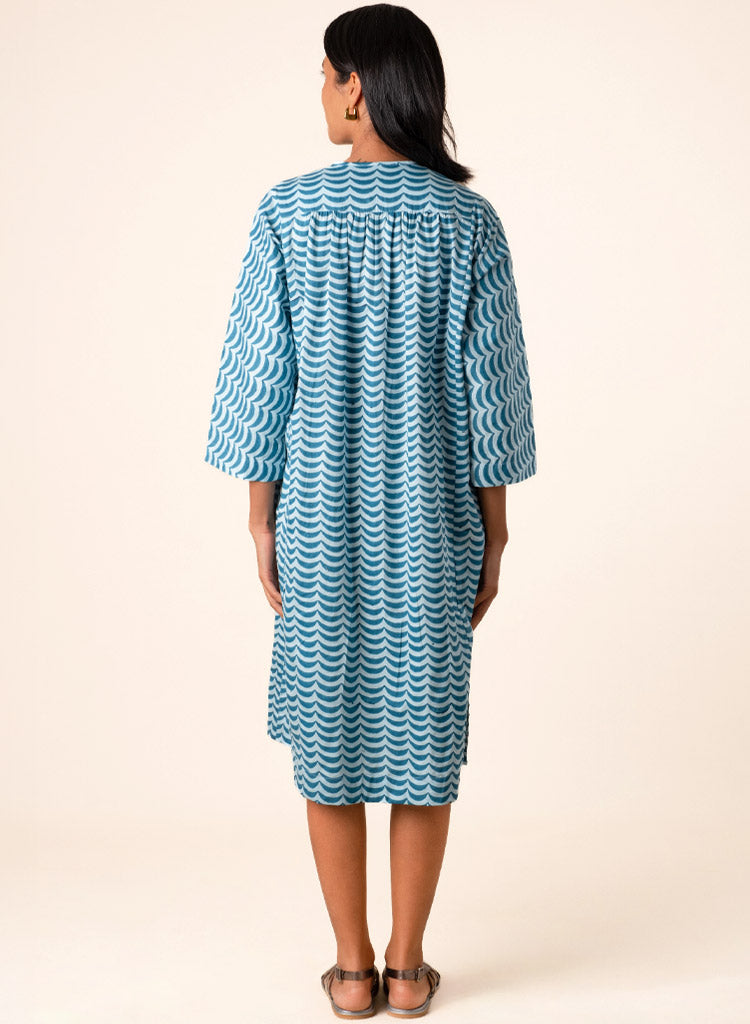 A relaxed fitting midi dress with neck ties and 3/4th sleeves. The model is 5'7" and is wearing size XS.