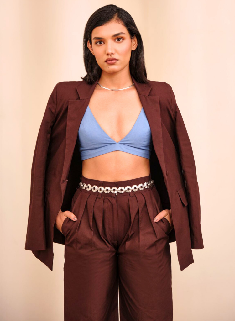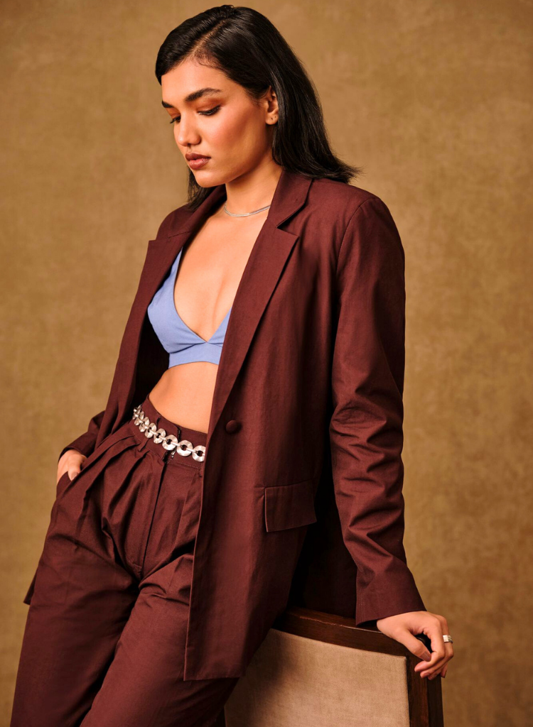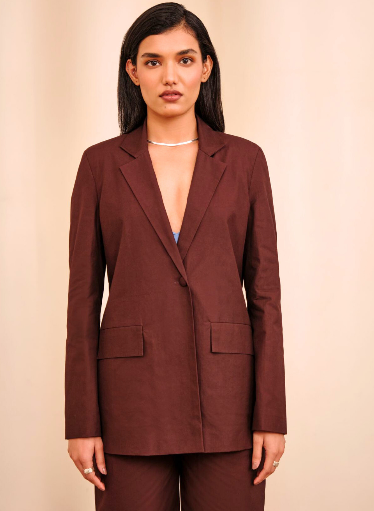 A notched lapel collar jacket with single breasted front featuring a front flap pockets, single button closure and a back slit. Length 28.5" . The model is 5'6" and is wearing size S.