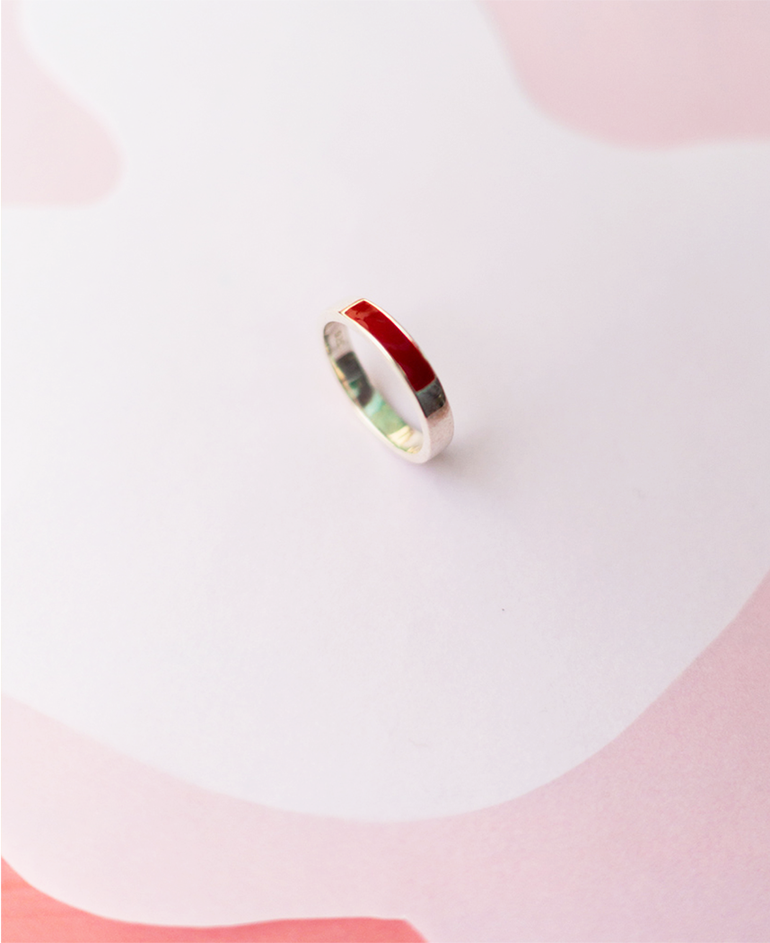 Simple solid silver band with crimson red enamel. Perfect for stacking with other rings. Available in sizes 10, 11, 12. Please specify your preference in special instructions during checkout. Made in silver and enamel.