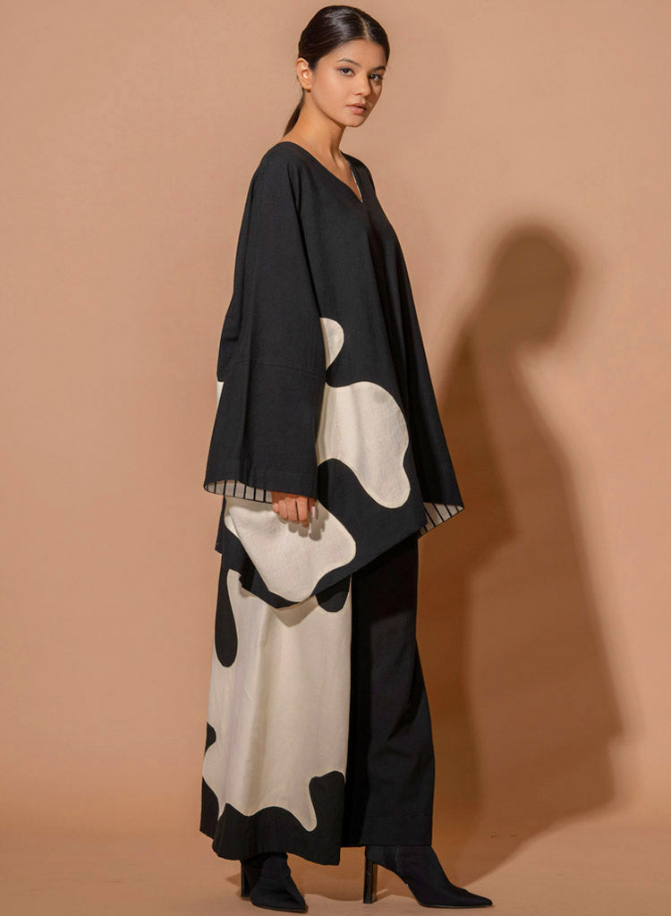 A two-piece set pairing the Cumin Shirt and the Cumin Pants. An oversized kimono-style shirt with contrast appliqué and contrast facing featuring a V-neckline and long sleeves. Length 30", Chest 74", Shoulders 37". The model is 5'6" and is wearing a free size.The tailored pants with contrast appliqué feature a flared hem. The model is 5'6" and is wearing a free size.