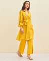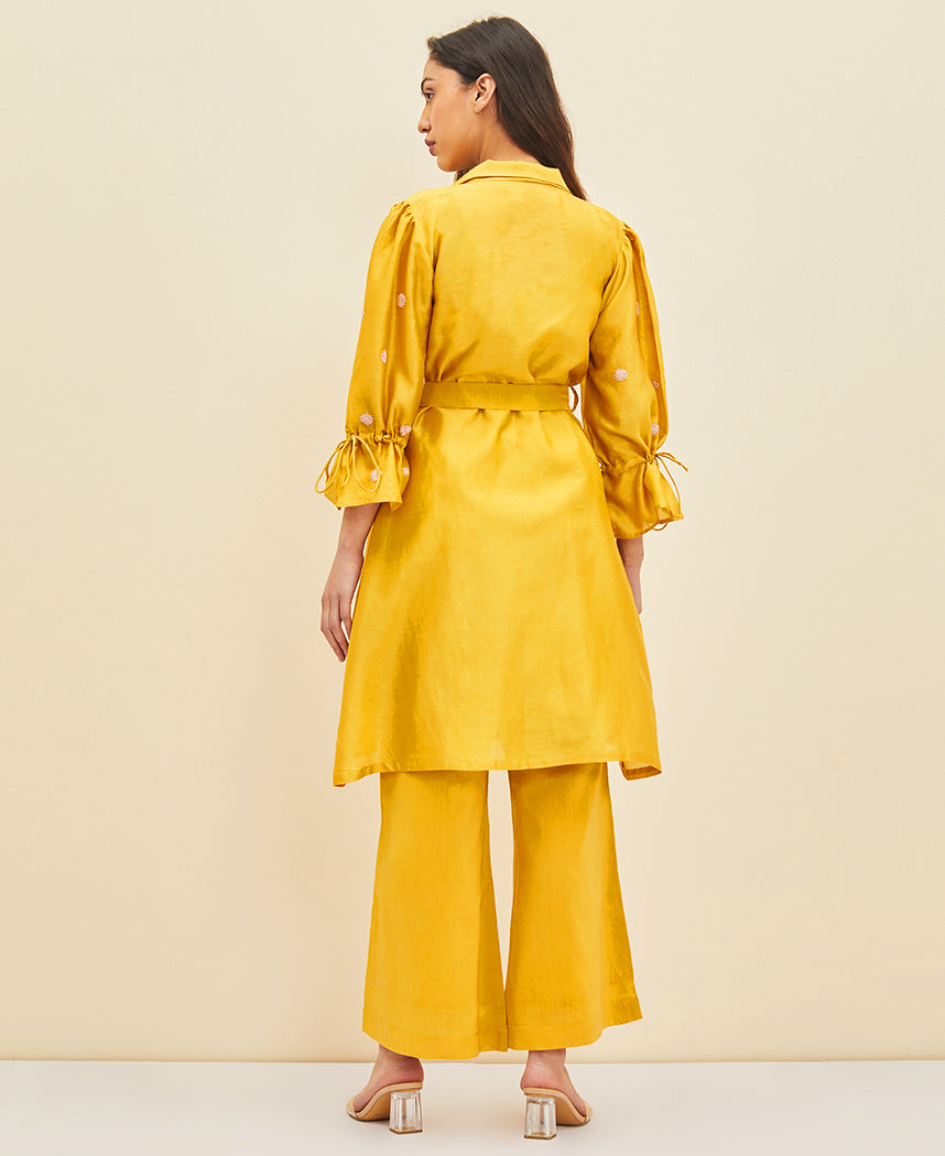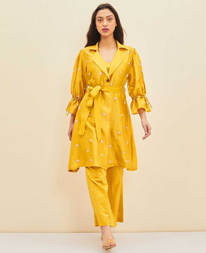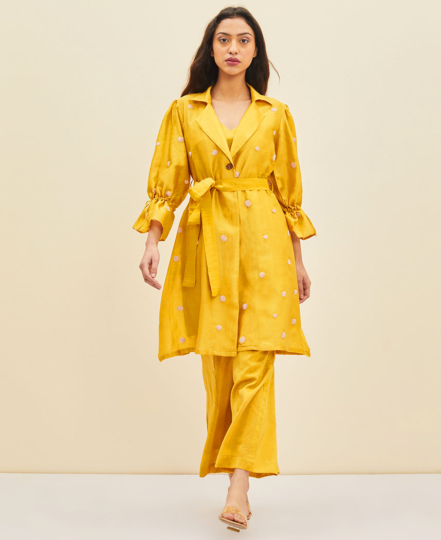 An A-line coat style dress with hand embroidered flowers and statement drawstring sleeves. Features an overlap front, lapel collars and a single button at the front. Comes with a matching detachable tie up belt and slip. Length 38".