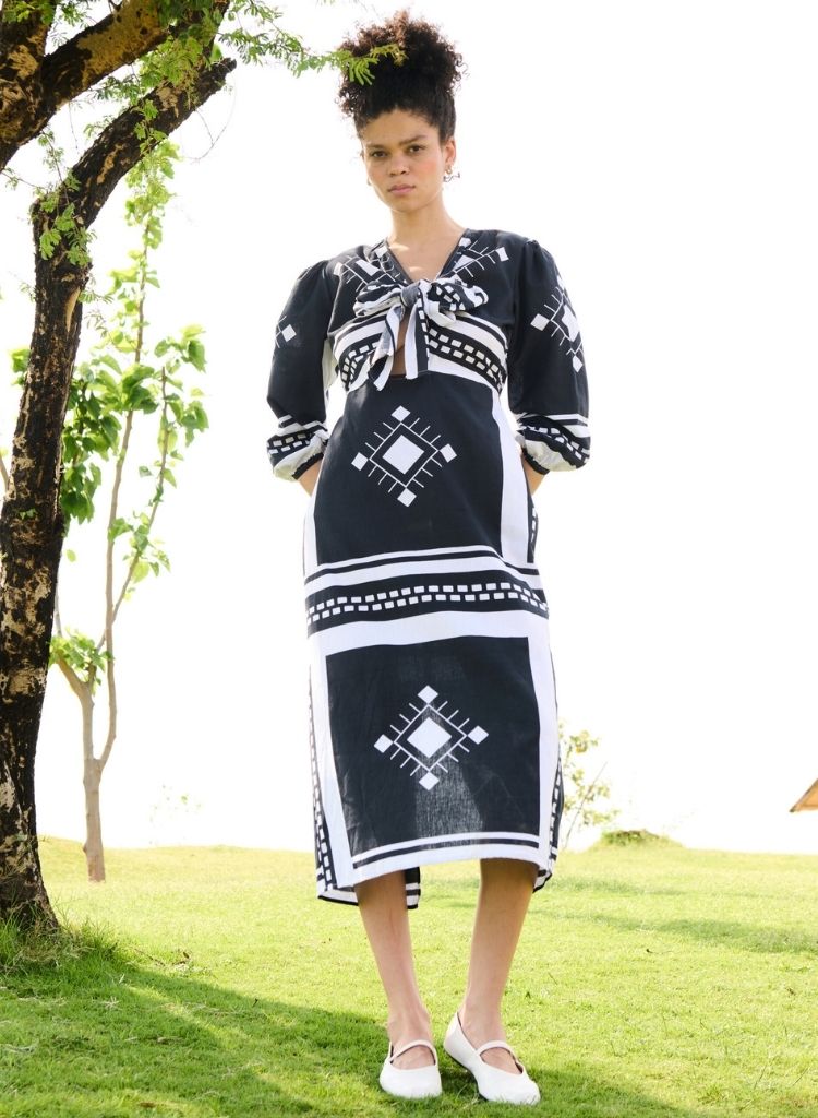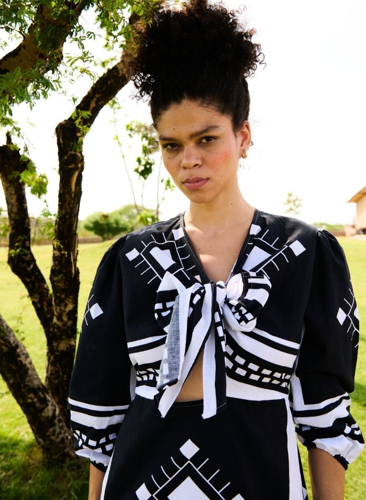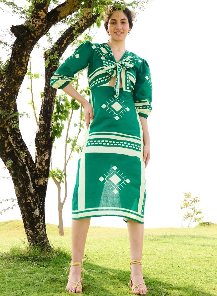 A printed maxi dress with a knot in the middle featuring a V-neck, elasticated sleeves and a back slit. Length 51". The model is 5'11" and is wearing a size M.