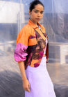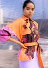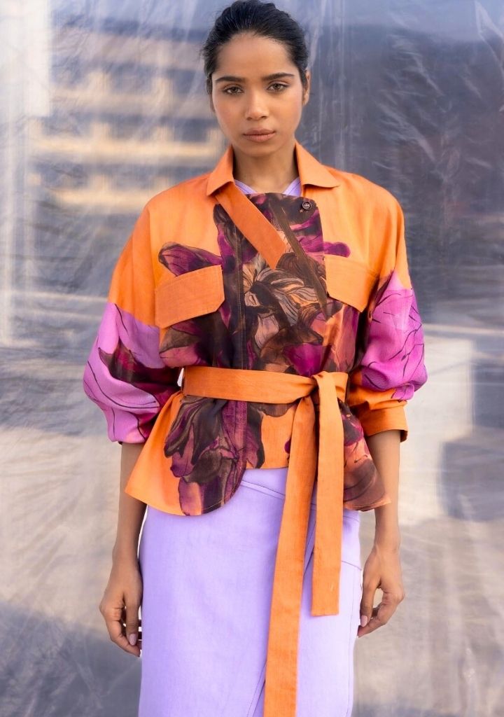 A printed biker jacket with flap detail, curved hem and attached belt featuring notch lapel collar, front metal zipper opening and long cuffed sleeves. Length 26". The model is 5'9" and is wearing size S.