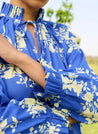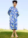 A printed midi dress with pleat detailing in the neck and sleeves featuring a round neck with a tie-up, side slits and inseam pockets. Length 48". The model is 5'11" and is wearing a size M.