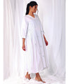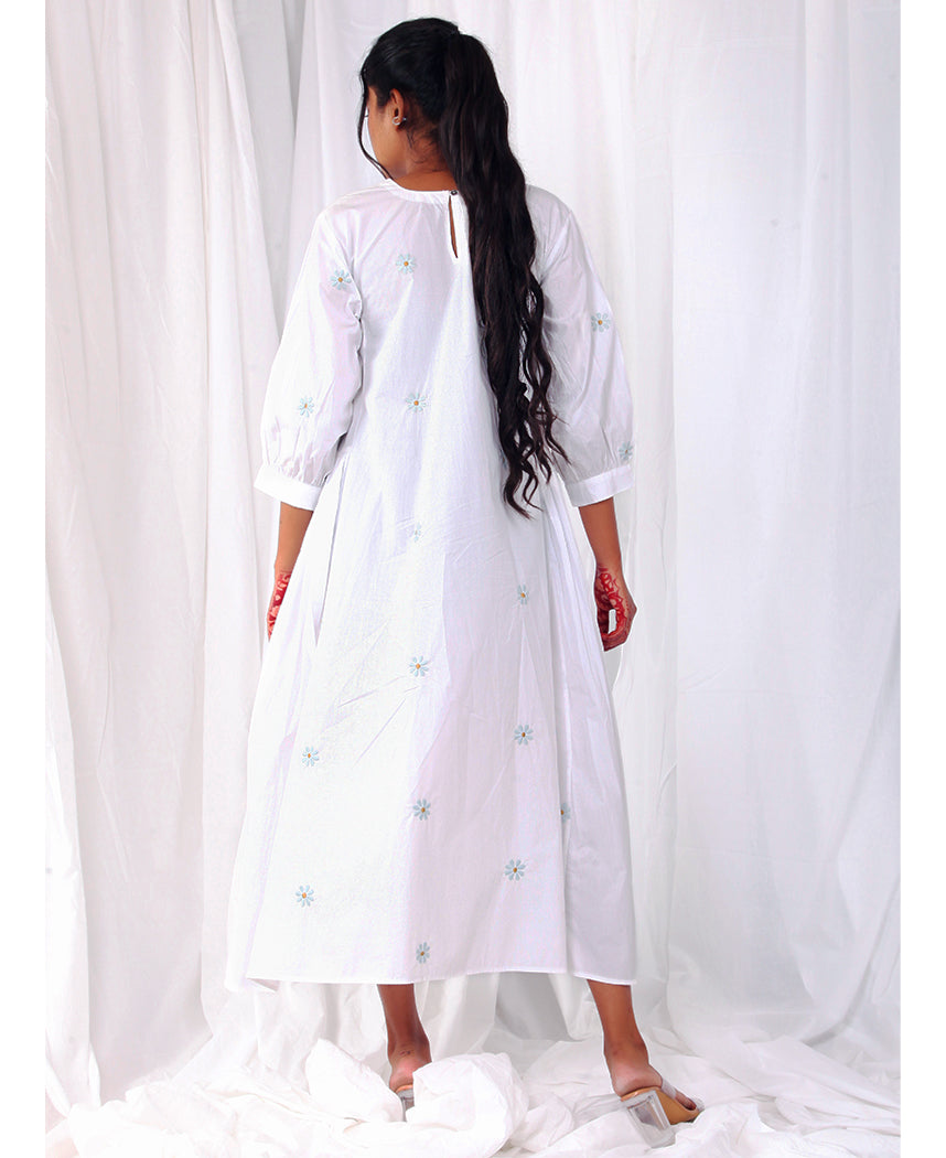 A floral maxi dress featuring a V-neck, pleats on both sides and cuffed sleeves. Length 48". Model is 5'8" and is wearing a size S.