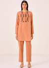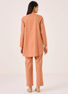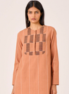 A Jamdani tunic with a curved front yoke and front buttons for fastening featuring long sleeves. The model is 5'9 and wearing a size XS.