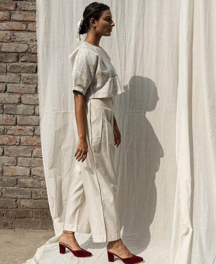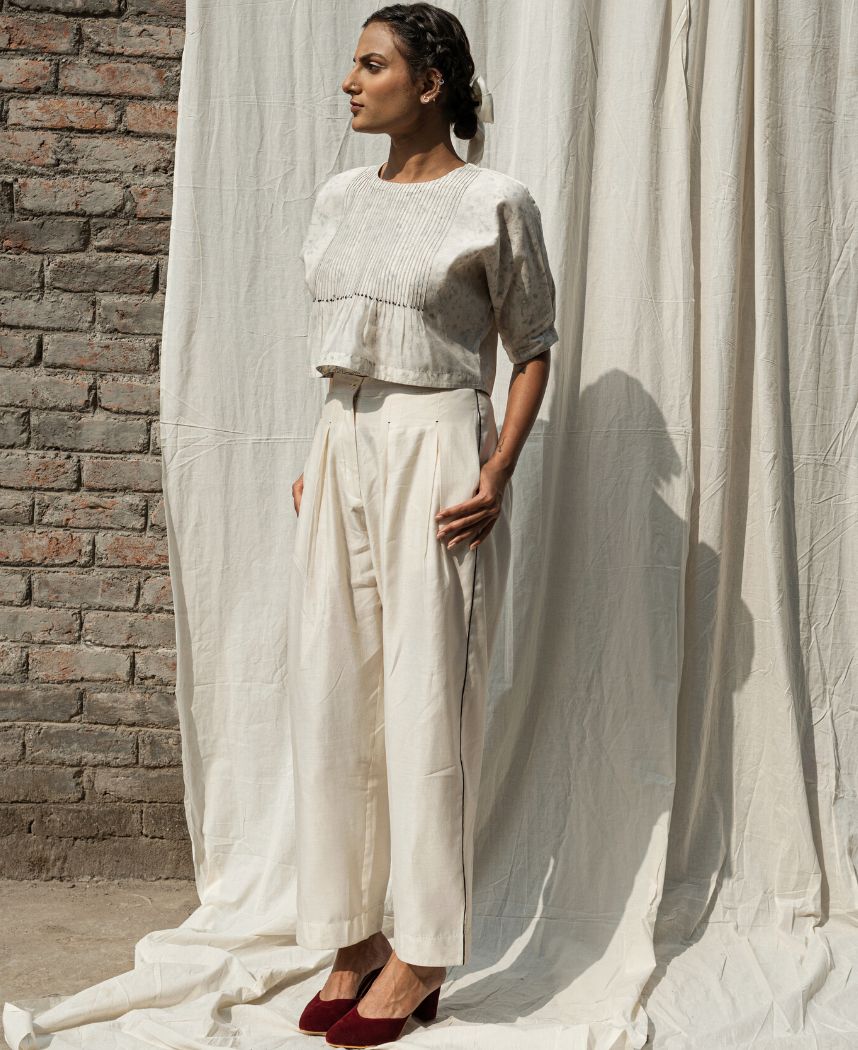 A pair of classic straight fit pants with tape detailing featuring a fitted front, elasticated back and inseam pockets. Length 39". The model is 5'8" and is wearing a size M.