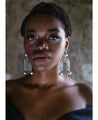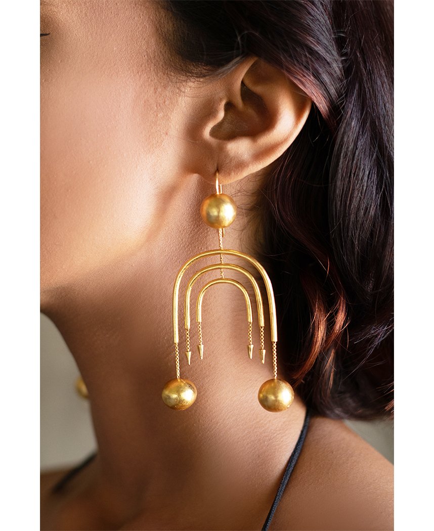 Art deco inspired earrings with concentric arches, featuring sphere and arrow details. Dimensions 8cm x 5cm. Both styles are made in silver while style in gold is made in gold plated silver.