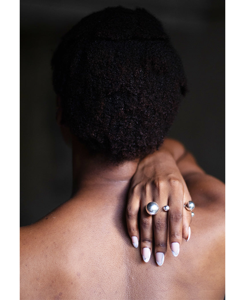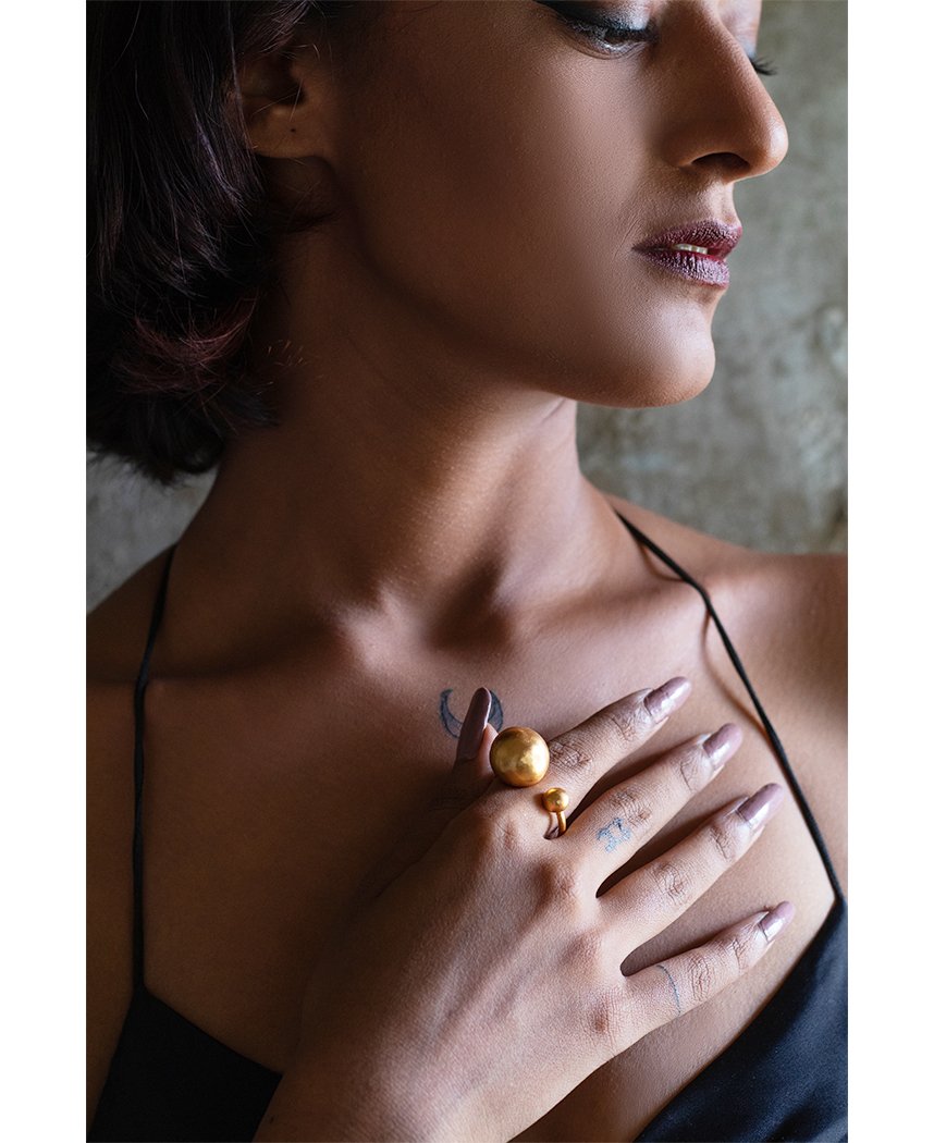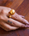 An art deco inspired ring featuring smooth large and small spheres in an open style. Dimensions 3.5cm x 3cm. Both styles are made in silver while style in gold is made in gold plated silver.