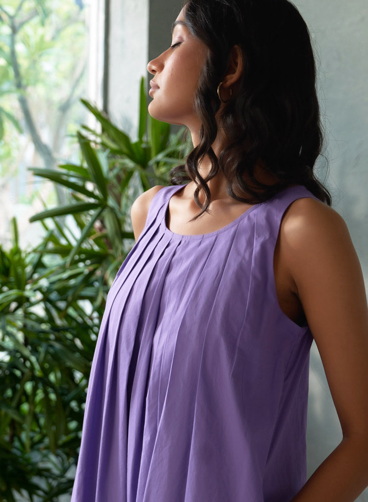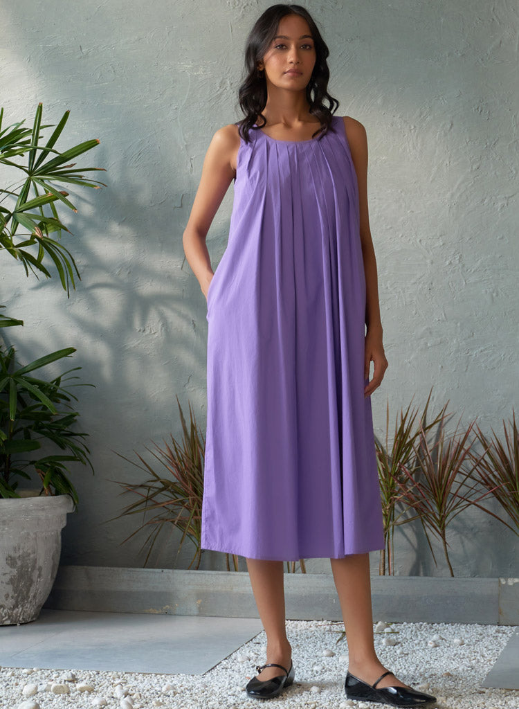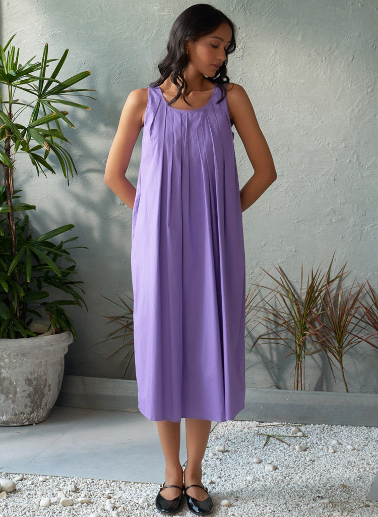 A sophisticated midi dress with an overlapping back panel with a keyhole detail featuring a U scoop neck and distinctive box pleats in the front for a structured yet elegant look. Length 48". The model is 5'10" and is wearing size S.