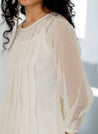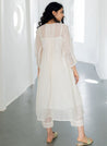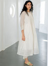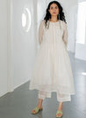 A two-piece set pairing the Dewy Mist Pleated Kurta and a pair of matching pants. The A-line kurta with bead embellishments on the bodice, a front button-down placket and pleat details features a round neck and 3/4th sleeves. Length 46". Comes with a slip. The relaxed-fitting, slightly cropped pants feature an elasticated waist. Length 36". The model is 5'7" and is wearing size M.