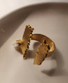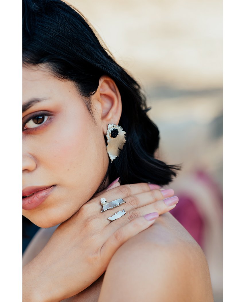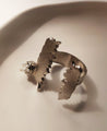 An asymmetric open ring inspired by the shape of pencil shavings and featuring a small cluster of glass beads. Adjustable. Handcrafted in brass with nickle plating.