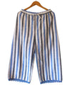 Relaxed wide-leg pants with contrast stripes and crochet lace at the hem. Features a drawstring waist. Length 33". The model is 5'5" and is wearing size S.