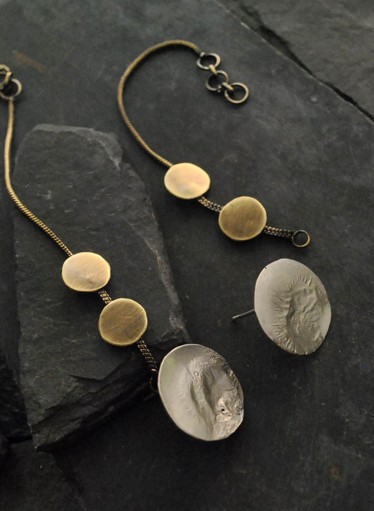 A pair of oxidized brass ear-chain that is a separate piece that curls around the ear adding a special visual quality. Comes with a push back closure. Dia 1.2 cm.