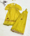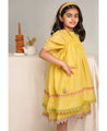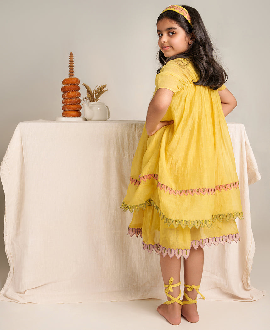 A two-piece gathered dress with pastel appliqué leaves at the hem. Features a tassel drawstring detail at the yoke. Has a keyhole back button on the outer dress and a concealed side zipper on the slip.