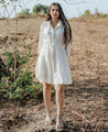 A shirt dress with a drawstring waist featuring a V-neck. Length 36". The model is 5'6" and is wearing size S. The model is 5'2" and is wearing size M.