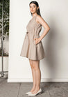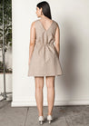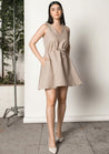 A mini A-line dress with a drawstring waist featuring a V-neckline and side seam pockets. The model is 5'7" and is wearing a size S. Length 34"- 38"